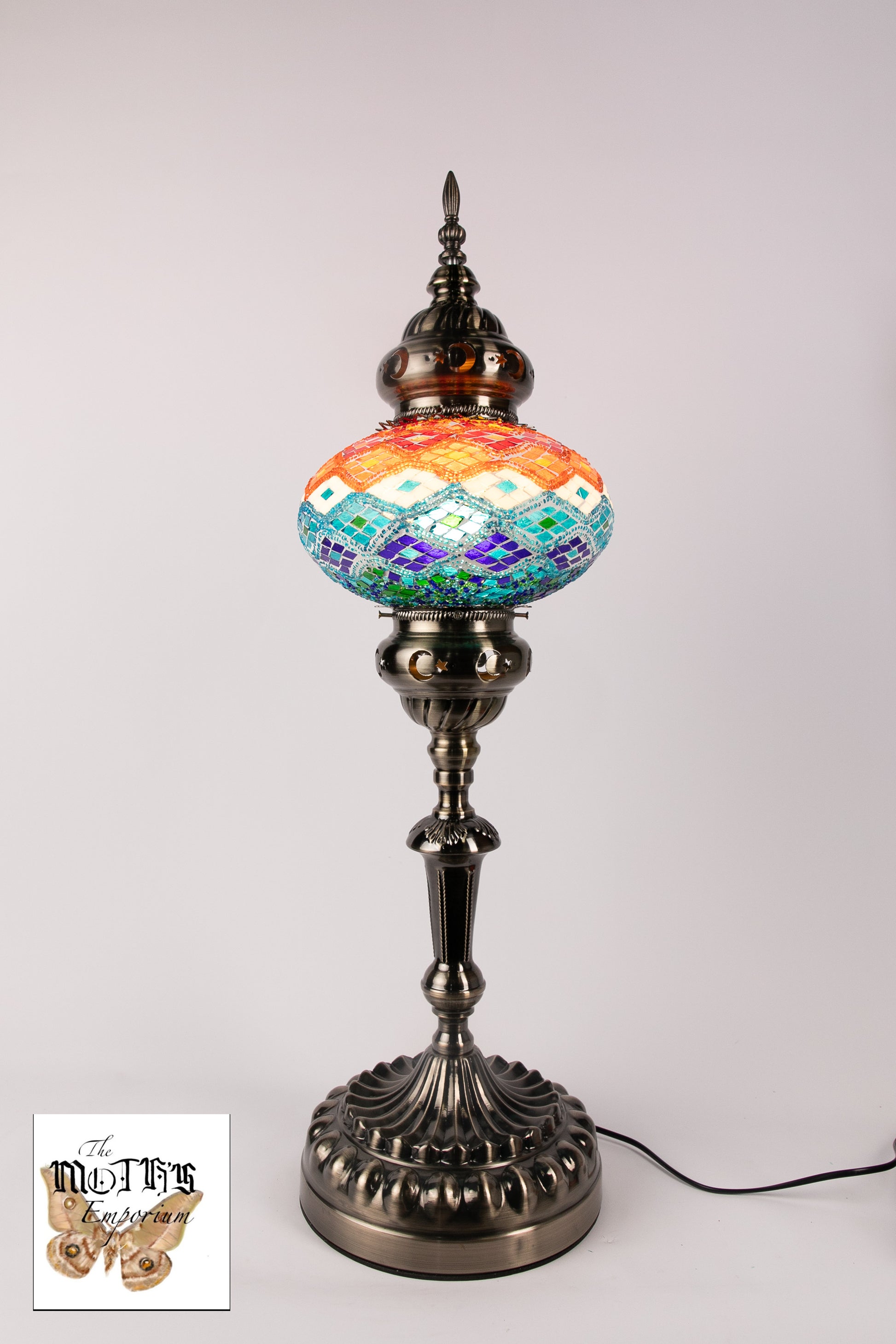 Introducing our stunning Large Moroccan-Style Table Lamp, a true testament to the beauty of artisanal craftsmanship. Carefully handcrafted, this lamp boasts individually cut colored glass pieces that come together to cast a kaleidoscope of hues, enveloping your space in an aura of enchantment. The antique-style brass base and intricate details evoke the grandeur of Moroccan design, infusing your room with a sense of exotic elegance. Elevate your decor with this remarkable piece that transcends function to become a true statement of artistry and style. With its grand size and captivating aesthetics, the Large Moroccan-Style Table Lamp promises to be the focal point of any room, exuding an irresistible allure that transports you to the heart of Morocco's vibrant ambiance.