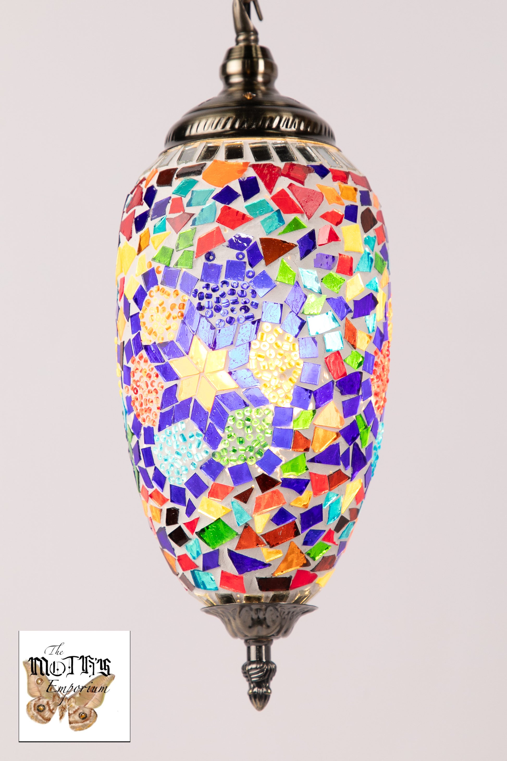 Crafted with attention to detail, this lamp's antique-style brass base complements the vibrant colors of the glass, creating a harmonious and timeless look. Whether placed on a side table, desk, or as a centerpiece, the soft and warm glow emitted through the meticulously arranged glass pieces will transform any room into a haven of beauty and ambiance. Illuminate your surroundings with the charm of a bygone era, brought to life through the fusion of classic design and handcrafted artistry.