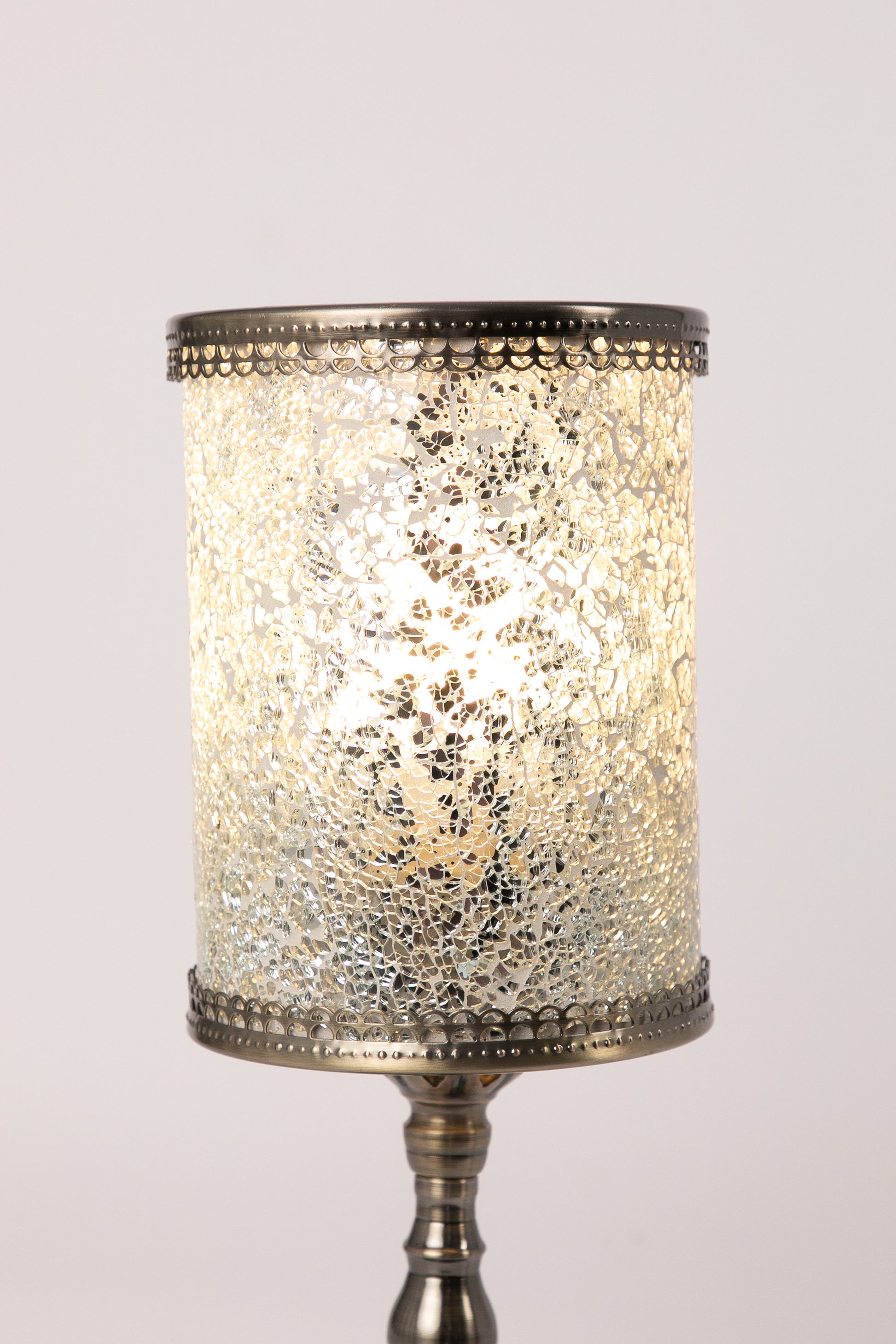 Crafted by skilled artisans, this lamp features a delicate balance of crushed glass and antique-style brass, creating a unique and captivating aesthetic. The crushed glass base reflects light in a mesmerizing dance, casting a warm and inviting glow that transforms your surroundings.