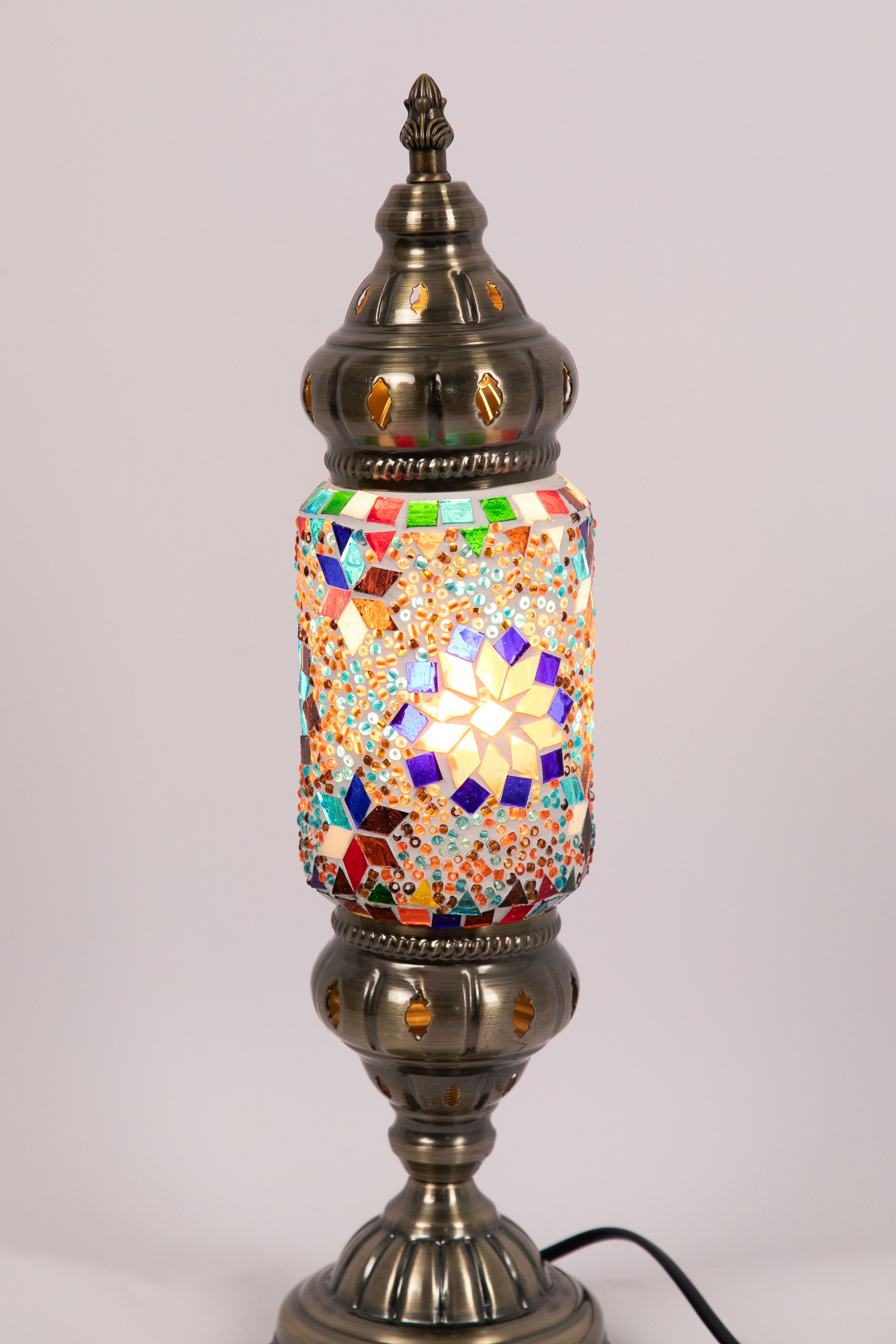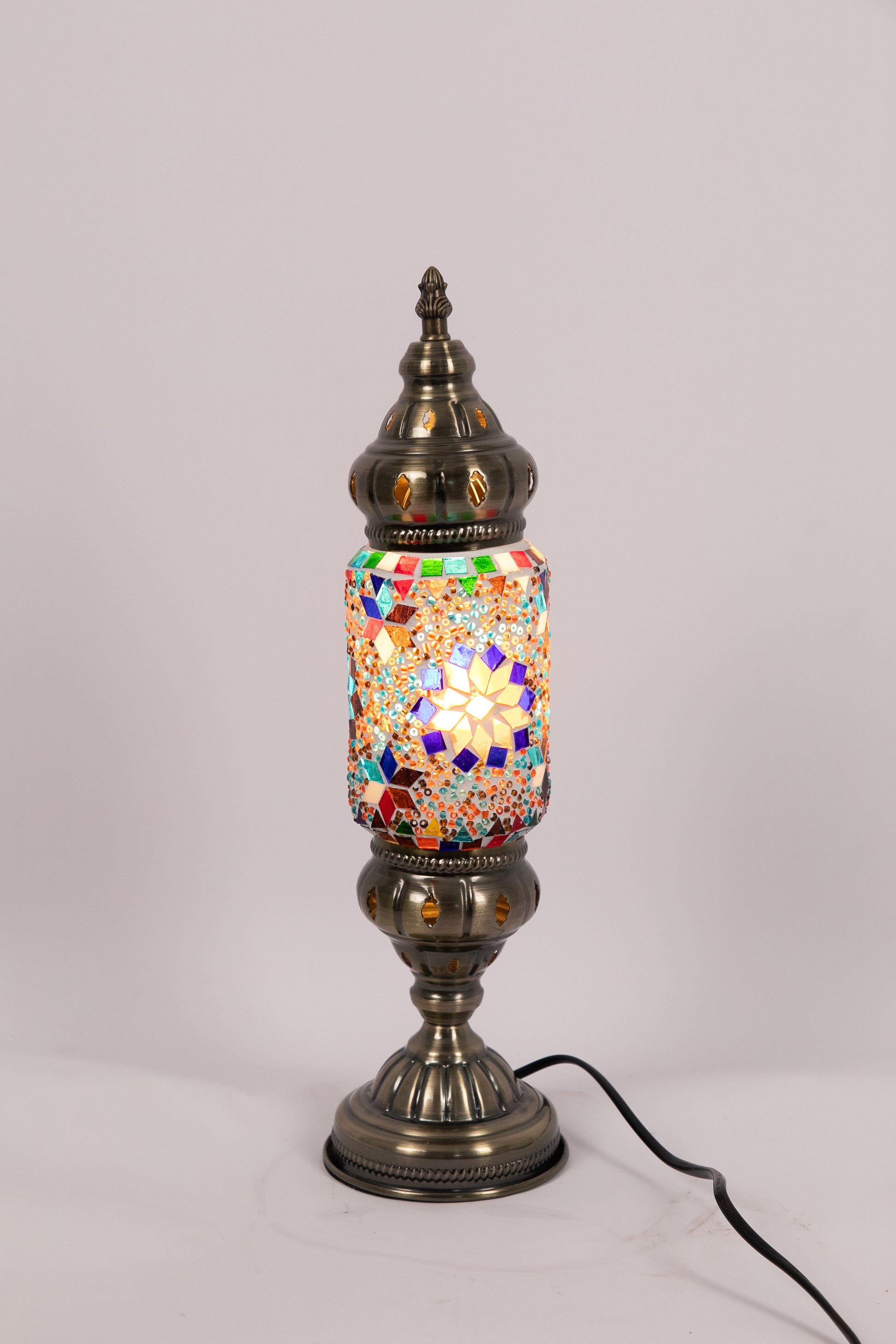 Introducing our exquisite Moroccan Lantern Table Lamp, a true masterpiece of craftsmanship and elegance. Handmade with meticulous care, each lamp features individually cut colored glass that casts a mesmerizing play of light and shadows, creating a captivating ambiance in any room. The antique-style brass adds a touch of timeless charm, transporting you to the enchanting world of Moroccan bazaars. Illuminate your space with a blend of artistry and sophistication – the Moroccan Lantern Table Lamp is more than just a light source; it's a work of art that transforms your living space into a haven of beauty and warmth.
